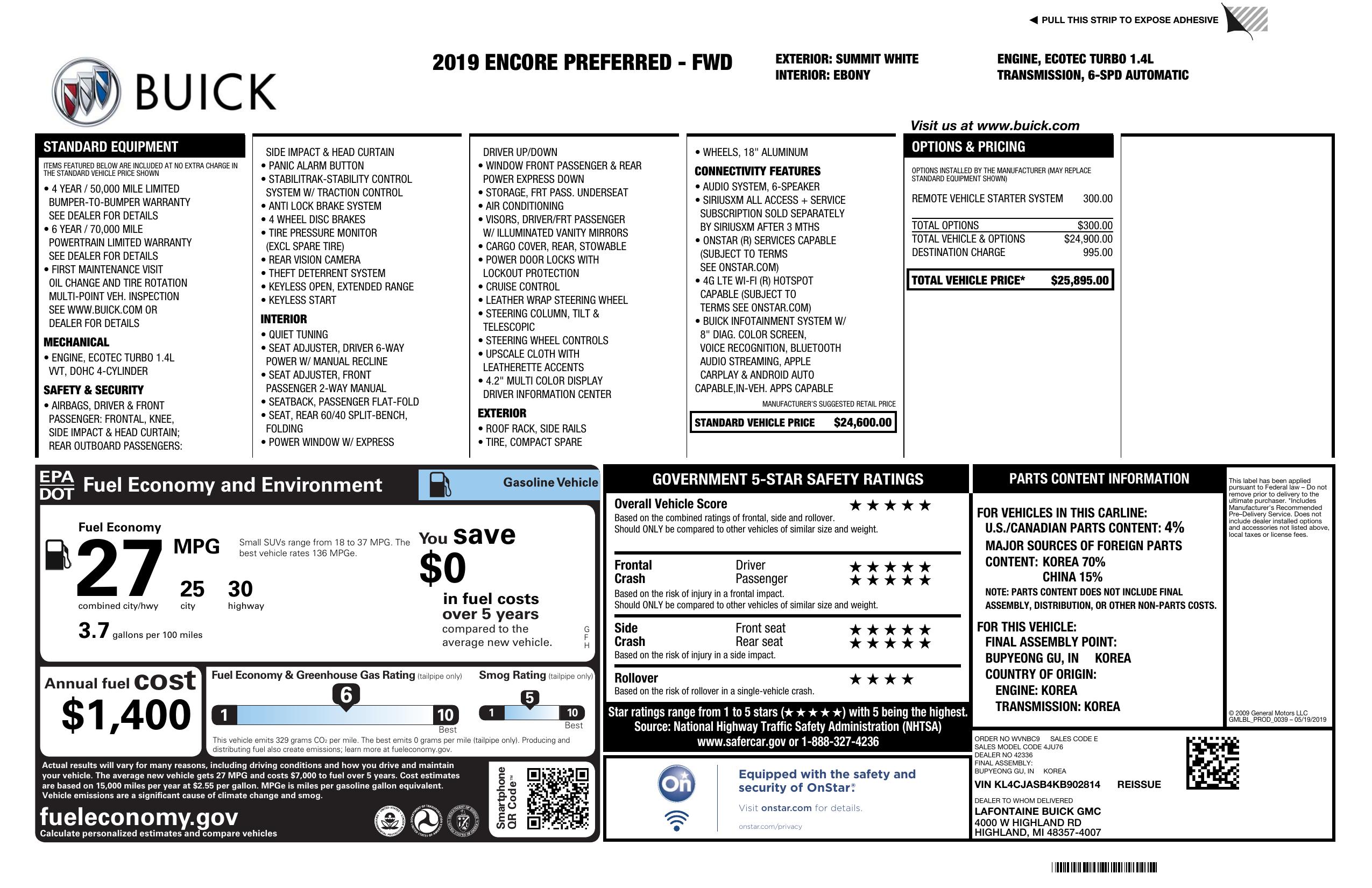 2019 Buick Encore Preferred, ONLY 37,000 MILES! Trim: Preferred Package (Keyless entry, Apple CarPlay/Android Auto, Power Seats, Recent Maintenance: Brand new tires, brand new brakes, and fresh oil change, this car is 100% road-ready. Clean Title in hand. The Full Story (Transparency Note) I believe in 100% honesty when selling a vehicle. This car carries a Total Loss notation on the CarFax history, however, the Title remains CLEAN. This often happens due to [insert reason if known, e.g., a theft recovery or minor cosmetic insurance claim]. Despite that history, the car has been fully inspected, serviced, and drives like a dream. Because of this history, I have priced it thousands below market value, making this the most affordable low-mileage 2019 Encore you will find. 1.4L Turbo Engine (Great on gas!), 8-inch Touchscreen with Backup Camera, QuietTuning Technology (Very quiet cabin), Fold-flat fold-down passenger seat for extra cargo space .Why buy this one? If you are looking for a reliable, low-mileage SUV that looks and drives like new but don t want to pay the $16,000+ dealership price, this is it. Come test drive it and see for yourself! Contact: MIKE 734-744-4450.